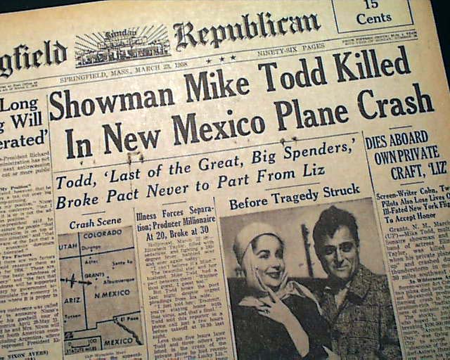 Less than a year after the marriage, Mike Todd perishes in a plane crash between Zuni and Grants, New Mexico. The plane is overloaded with excess baggage and ice develops on the wings during a storm over Arizona. His body is unrecognizable and only his wedding ring is recovered. Elizabeth should have been on the same plane but she had just had appendicitis and is recovering from a cold and a 102 degree fever. Elizabeth is devastated. Debbie comes around to baby sit her kids while Eddie and Elizabeth Taylor go to the funeral.